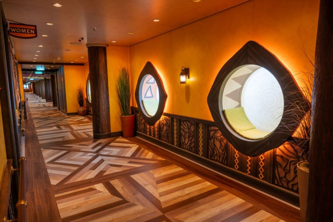 The dining area is lined, with depictions of animals and nature realized through lighting and special effects, and. There’s even a wall of magical windows displays a rotation of vibrant sunrises and sunsets throughout the meal. Oh and at the center of the dining establishment are tiered risers that mimic the look of African drums and serve as the stage for a lineup of live entertainment.